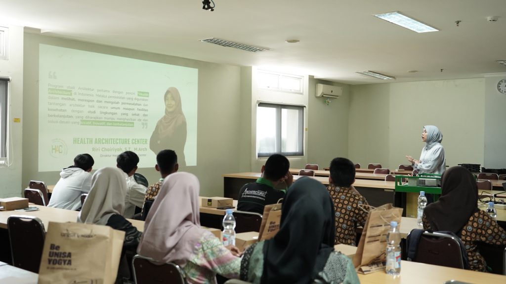 Kegiatan ArchitecTour diawali dengan sesi pemaparan materi terkait Arsitektur Sehat sebagai penciri Program Studi Arsitektur UNISA Yogyakarta. Pemaparan materi disampaikan oleh Ibu Ar. Riri Chairiyah, S.T., M.Arch selaku Ketua Program Studi.