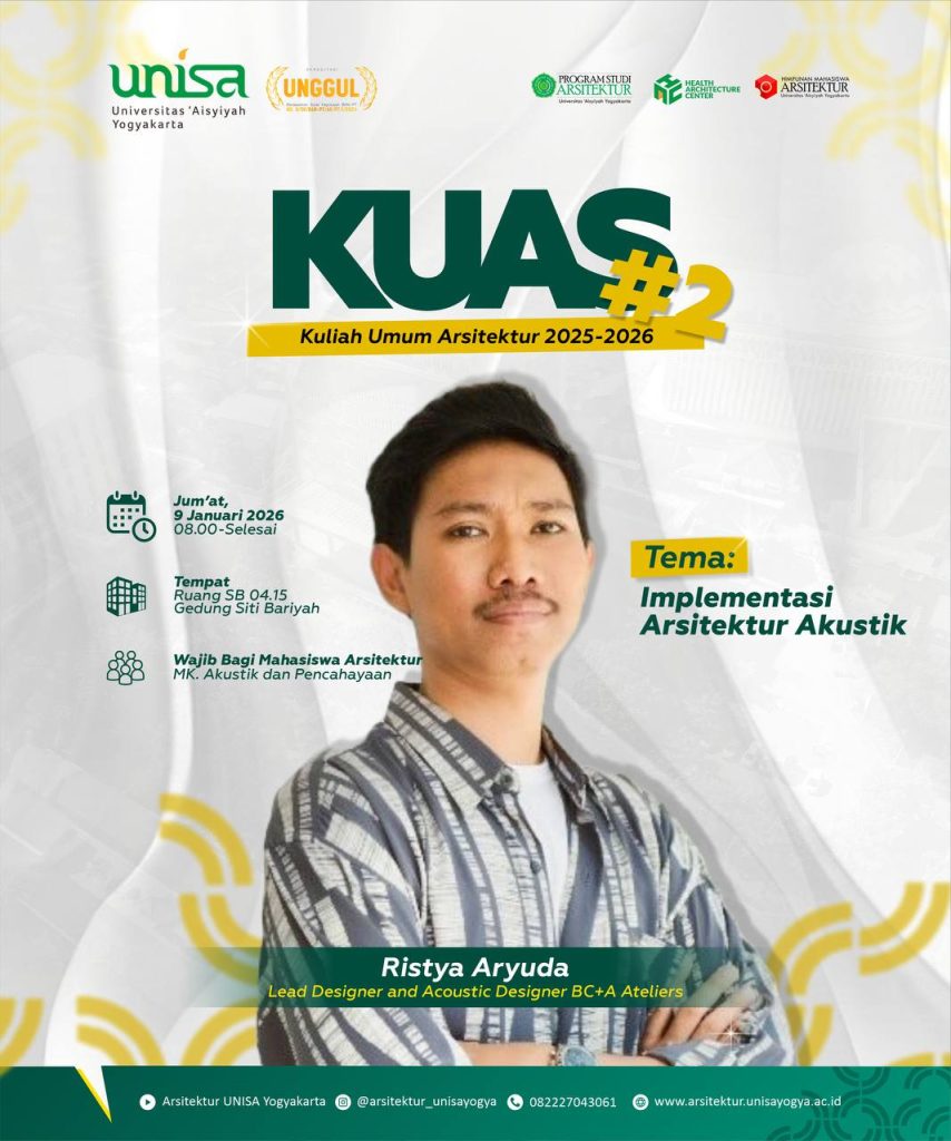 Program Studi Arsitektur Universitas ‘Aisyiyah Yogyakarta menyelenggarakan Kuliah Umum Arsitektur #2 pada 9 Januari 2026 yang mengangkat tema Implementasi Arsitektur Akustik. Kegiatan ini menghadirkan Ristya Aryuda, Lead Designer and Acoustic Designer di BC+A Ateliers, yang juga merupakan salah satu mitra Program Studi Arsitektur UNISA Yogyakarta. Kuliah umum ini diikuti oleh mahasiswa yang mengambil Mata Kuliah Akustik dan Pencahayaan, sebagai bagian dari upaya memperkaya pemahaman mahasiswa mengenai penerapan prinsip akustik dalam perancangan ruang dan bangunan. Dalam kesempatan ini, pemateri berbagi pengalaman serta pengetahuan terkait bagaimana desain arsitektur dapat memengaruhi kualitas suara dalam suatu ruang